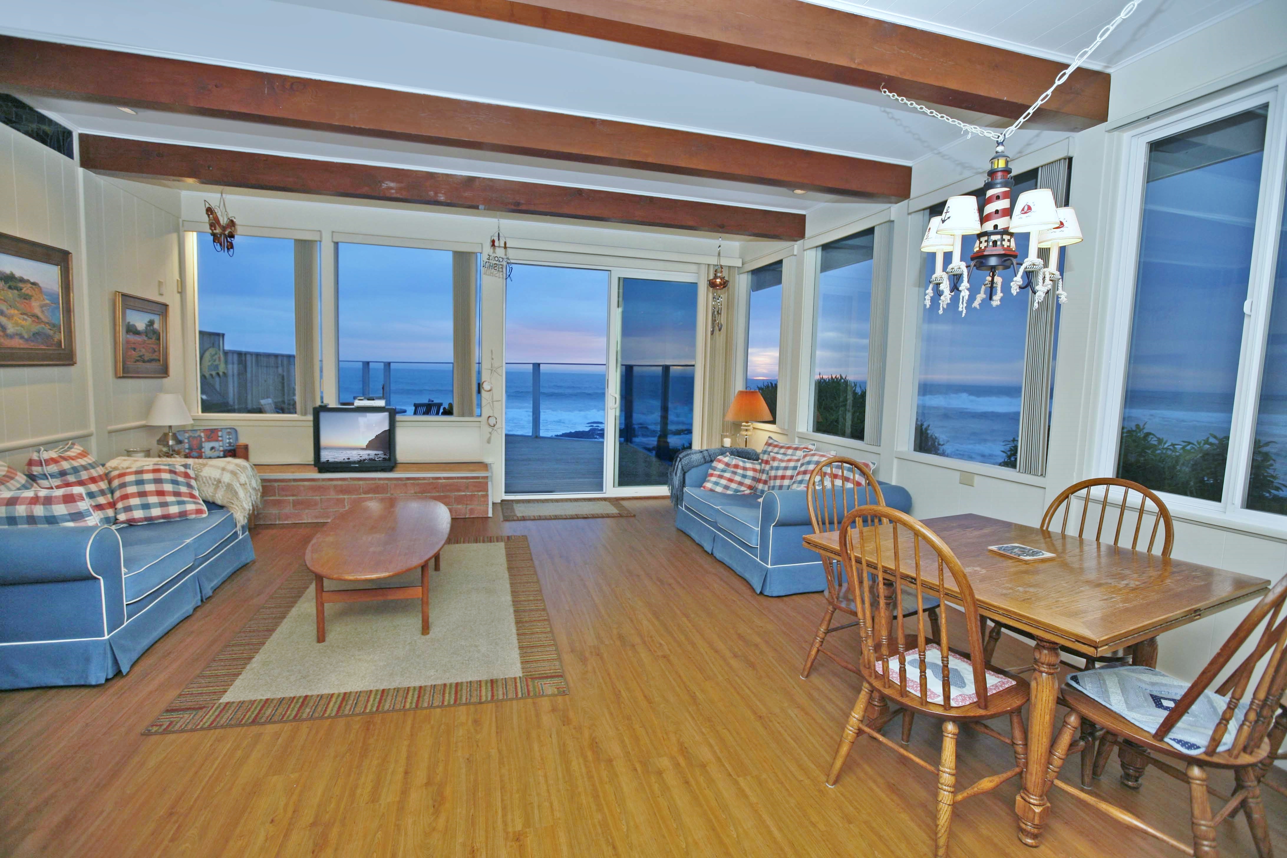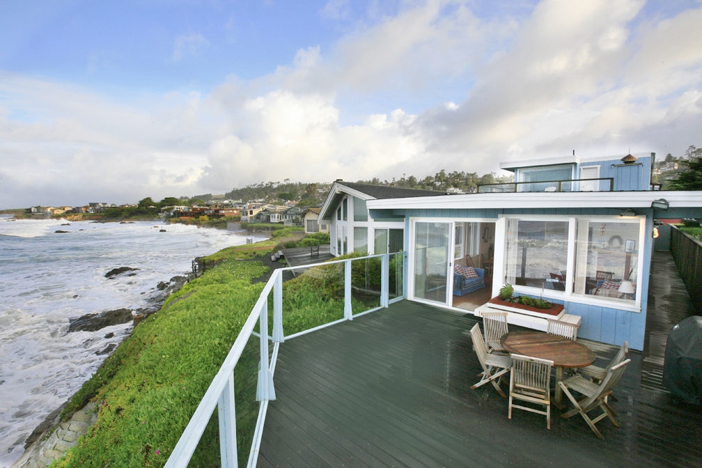 “The Wave Watcher sits proudly on a stunning promontory in Cambria’s serene Marine Terrace. From the large deck, as well as the living area and master bedroom, one can watch whales and sea otters basking in the ocean below while pelicans cruise overhead. Harvey Beach, six houses away, has a large sandy beach and abundant tide pools and the Fiscalini Ranch, a few blocks further down, has miles of bike and hiking trails. The Wave Watcher is the perfect get-away retreat for the nature lover, artist, or anyone wanting to enjoy a peaceful vacation in a natural paradise. The home consists of 3 bedrooms and 3 baths including one bedroom and bath on the first floor. There is a large first floor great room with living room with fireplace, dining room and kitchen, all with spectacular ocean views. The second floor consists of two great master bedrooms, one with ocean view and ocean view deck and the other with its own fireplace. The home is filled with light and the ocean view deck is expansive and protected from the wind by glass walls. There is also a two-car garage plus long driveway.